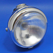 Chrome 6 1/2" headlamp unit, complete with switch panel and ammeter, equivalent to the Lucas MU42 model. The MU42 lamp is similar to the earlier DU42, but with a different rim fixing. It was...