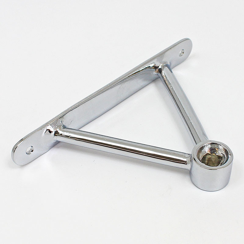 Triangular mirror mounting bracket, similar to the Lucas style mount used on some MG's. Flat base plate 140mm x 19mm with hole centres 119mm apart. Two 9mm diameter rods connect the plate to the mirror head boss, overall bracket height 90mm. Lost wax cast in bronze, available in chrome plated finish only.
