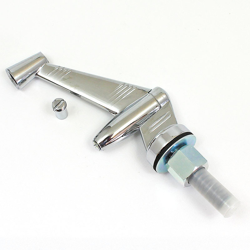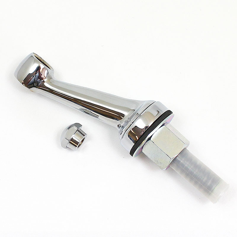 Four styles of chrome mirror arms that mount through a 16mm hole in panel. With swing back spring (protected in plastic sleeve) protuding 50mm under arm, secured with a 3/4" AF nut. Supplied with a special chrome mirror head domed nut. Very popular classic mirror arms. -- 103mm long stem, pivot point in stem