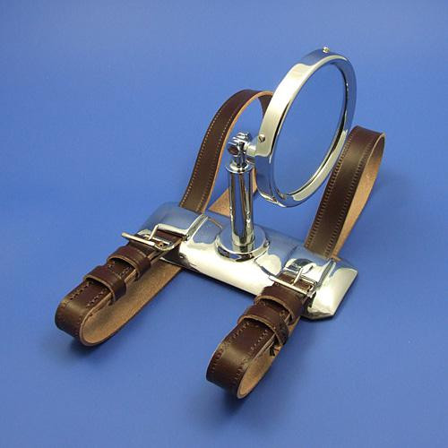 Wheel mount rear view mirror of our own manufacture, secured to the wheel with two 770mm long x 25mm wide leather straps - brown or black leather straps are available, please select your preferred option. Brass construction, 120mm or 145mm diameter round mirror head, flat or convex glass. Supplied in a choice of chrome, nickel or polished brass finish. This mirror has various adjustment points to cover most applications. We do not advise use of this mirror if wheel discs are fitted on to the wheel. Mirror base size is 194mm x 72mm. Heavywight base casting with machined components all hand assembled in our workshops.