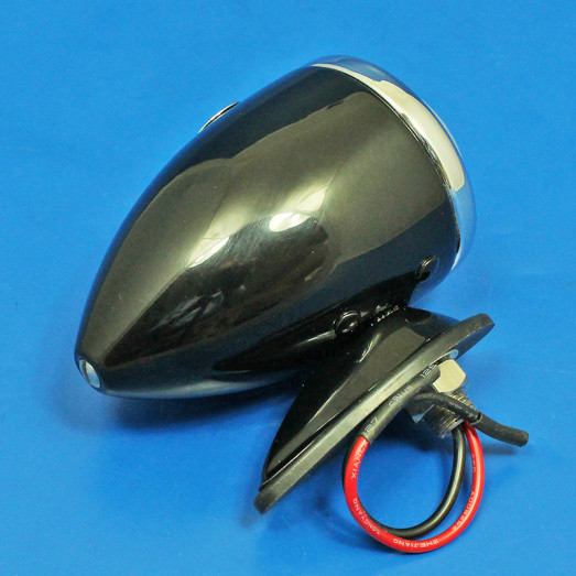 Vintage 'Toby' side lamp equivalent to Lucas part number 1142. Originally fitted to many quality cars including Rolls-Royce and Bentley. All brass construction with gloss BLACK powder coated finish to lamp body and plinth, with a CHROME rim. Converted bulb holder arrangement to provide indicator and side lamp functionality (as our 424A bulb holder conversion for the 1130). Takes WEDGE T10 base capless bulbs - part numbers B501 and B921A (12V only), supplied. Upgrade to LED functionality with lamp kit 424ALEDBK and and electronic flasher unit LEDFLASH3. Rim and lens arrangement as original lamp.