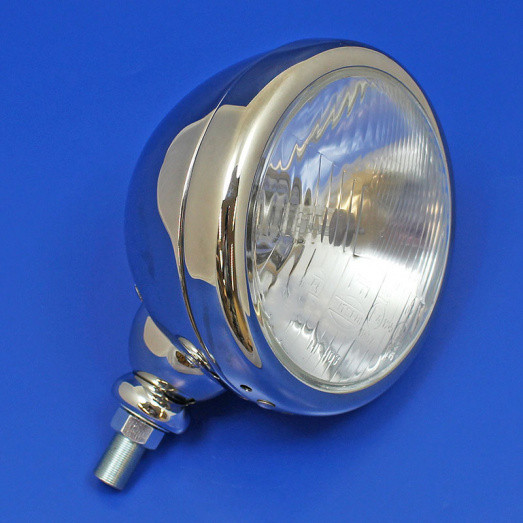 5 3/4" spot lamp finished in highly polished stainless steel with a chrome on brass 'Toby' medallion on top of the shell for a period look. Similar in style to 6" lamps of the period from Raydyot, Desmolite and Lucas. Fitted with a 5 3/4" round H1 main beam or driving light unit. Domed lens. Metal reflector without pilot bulb. E Marked. No bulb included - accepts H1 P14.5S type bulbs. Either browse the Head, Spot & Fog bulb category for your preferred H1 type, or select one of our most popular options from the drop down box below. Part numbers B465 (6V Halogen), B448 (12V Halogen), B466 (24V Halogen), B448P (12V Halogen upgrade bulbs with up to 50% more light) or our new LED upgrade - H1LED-P60.