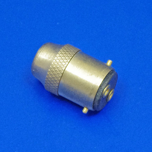 Double contact BA15D bulb holder plug with solder connections - two part assembly (unscrews). To wire up, unscrew the body, push the brass connectors from the bakelite body, pass wires through the knurled cap and bakelite, solder wires to the brass connections and reassemble. Available in Brass or Nickel.