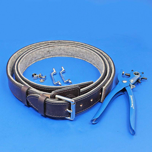 Supplied with two chrome on brass staples for 1 1/2" belts, a leather hole punch and 4 stainless steel Chicago screws. Assemble the strap on the bonnet and measure up the required fitted length of belt allowing for approximately 3" to be fed through the mounting staples, doubled back and secured back to the strap. Then cut the ends of the straps to the length required, doubling them through the staples and securing with screws through the holes you make with the leather punch supplied.