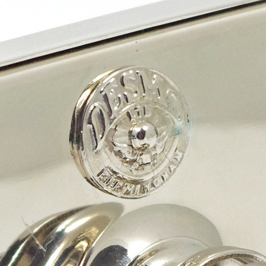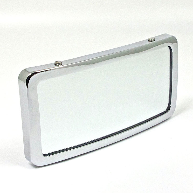 Brass rectangular CONVEX glass mirror. Case 6 1/4" x 3 1/4" (155mm x 80mm) with central rear mounting clamp. Cast bronze Desmo medallion (finished as the mirror body) riveted to the back of the mirror case. Reproduction of a popular style of period mirror produced by Raydyot and Desmo (the very popular Type 36). All brass construction, available in chromium or nickel plated finish, Polished stainless screws to outside of rim.