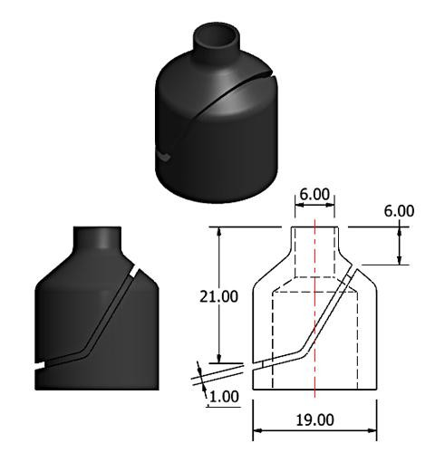 Angled as sketch, black, 6mm spindle, 15mm approx. wide panel hole, cut on angle.