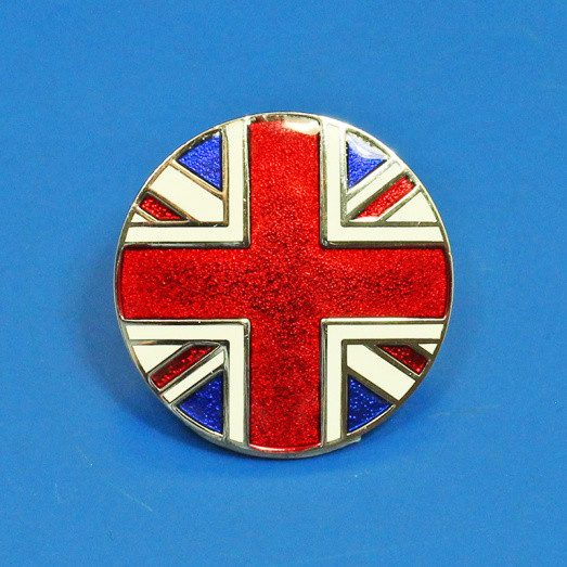 Patriotic national flag badge of the United Kingdom - Union Flag - hard jewellers' enamel with chrome finish - multi coloured, 31mm diameter, supplied with two piece threaded fitting for mounting on to bonnet or grill or old RAC badges. Major thread M8, with M3 slotted pan head screw that screws into the body of the M8 stud. Can be used to replace the badges on some vintage Royal Automobile Club (RAC) grille badges and emblems.