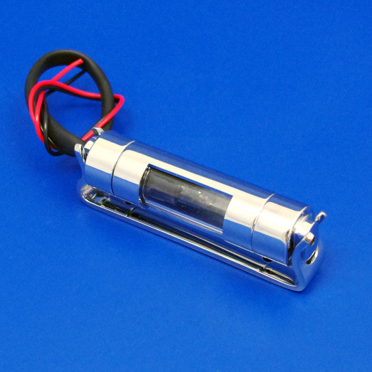 Cylindrical dash lamp, all brass construction - available polished brass, chrome with powder coated black end caps, chrome or nickel plate. Centre tube 25mm diameter can be rotated to adjust light position. Supplied with clip base. 90mm long. This lamp has no switch incorporated. Uses a Wedge T10 bulb, for spare bulbs please see our B117B (6v) of B501 (12v).