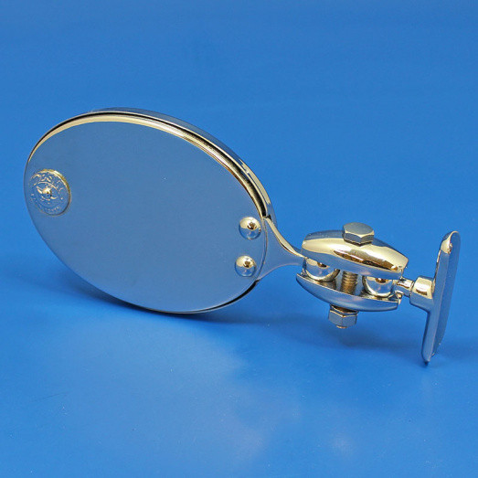 Oval type convex glass mirror equivalent to the Desmo 263 model. Cast bronze Desmo medallion (finished as the mirror body) riveted to the back of the mirror case. Suitable for vehicles of the '30's. Head size 110mm x 82mm, overall length 175mm. Complete with concave base mounting bracket 58mm x 14mm, hole centres 43mm approx. Our own manufacture, brass and bronze construction, recreated from an original 'Desmo' mirror pattern, polished brass, chromium or nickel plated finish. Although these mirrors were originally made for right hand mounting we do offer left hand if specified. The lost wax cast medallion is marked Desmo across the top, with winged car motif in the centre and Birmingham across the bottom, supplied in polished bronze, chrome or nickel plated finish to match the mirror.