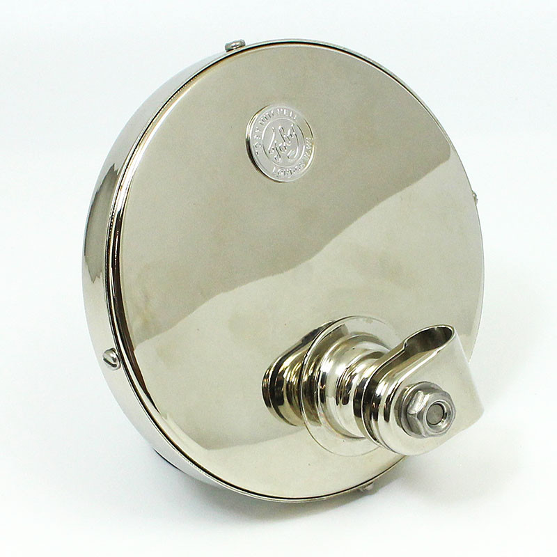 Hand spun brass round mirror head 145mm diameter. A quality reproduction of the Lucas 5 5/8" diameter, 150 model mirror. Supplied with flat or convex glass as originally offered - Type 150L and Type 150 respectively. Fitted with 3/8" (10mm) mounting clamp as standard. Available in chromium or nickel plate finish, or as polished brass.