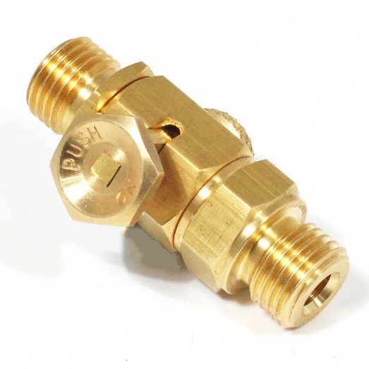 Hexagonal push on/off in line tap with 1/4“ BSP male threads. 1/4" BSP thread tank side, 1/4" BSP outlet thread with 60 degree cone seat for solder nut and nipple type fittings. Overall dimensions 50mm long (including threads) and 16mm diameter. This tap is supplied bare, please order fittings as required separately. A solder type nut and nipple can only be fitted to the outlet end. The 1/4" BSP thread under the hexagon has a seating flange, so can be screwed into a tank.