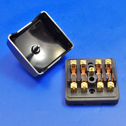 Fuse box equivalent to the Lucas type SF4, four glass fuse type box. Base 73mm x 72mm x approx 60mm overall height. Centre screw to lid top, black bakelite. Supplied without fuses - see part number GLASSFUSE. Lid marked with 'MODEL SF4 TYPE' in raised lettering