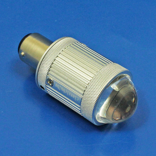 High performance CSP 1860 LED upgrade for American Pre Focus headlamp bulbs with the P15D 30 base. Integral aluminium heatsink. Accepts 5 to 9V input voltage - optimised for 6V, negative OR positive earth systems. High and low beam - 1600 Lumen high beam, 1600 Lumen low beam - with a soft beam pattern. In testing, much brighter (LUX measurement at fixed distance) than BA5659 (35/35W).