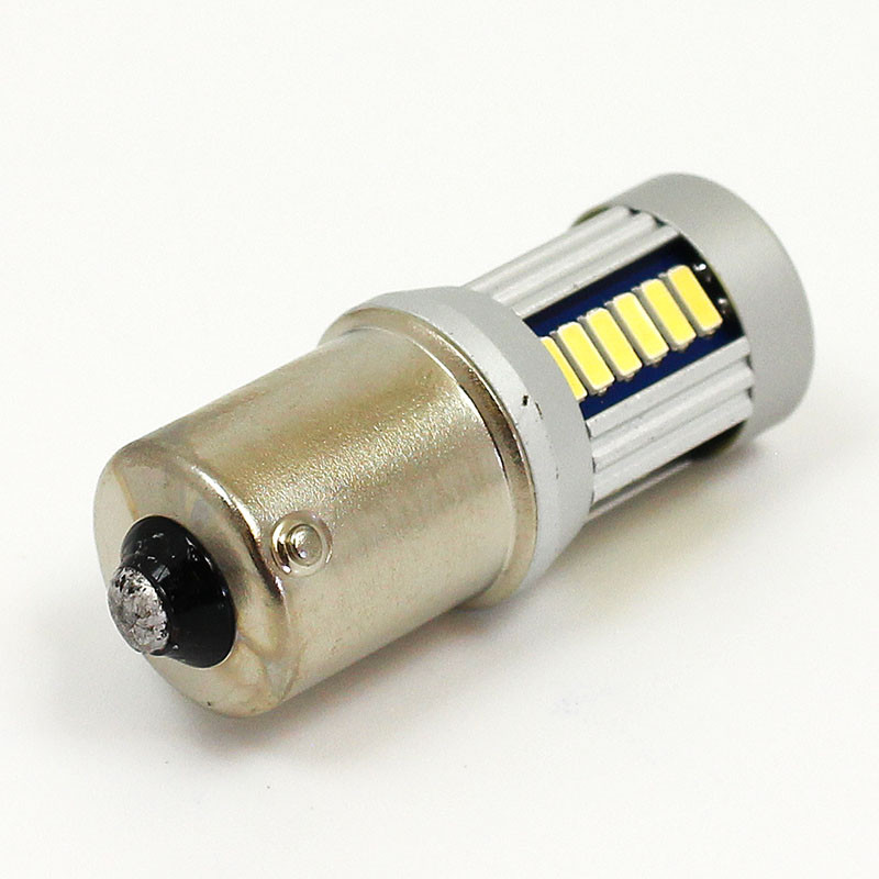 30 x 4014 SMD LED BA15S 6 Volt multi-directional bright white lamp. LED upgrade and replacement for B317 single filament type bulb. BA15S base. In testing, directly comparable in light output to 6V incandescent bulb B317/B317B. Compatible with either negative or positive earth systems. Very low current draw - over 75% less than incandescent and halogen bulbs so great for low powered electrical systems. 6000K bright, white colour temperature. Good for Reverse applications. B307LEDWW or B317LEDA are better for indicator applications. Maximum diameter 18mm, total bulb height 43mm.
