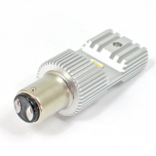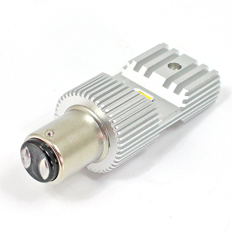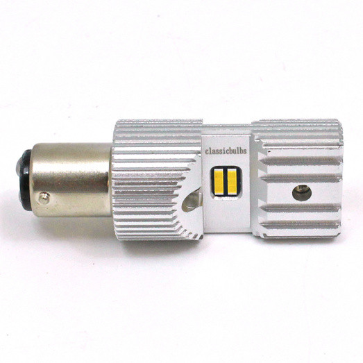 This bulb is a great LED upgrade alternative to a number of higher-wattage 12 and 24V headlamp bulbs including B171B, B1248B and B194. In testing, this LED lamp proved significantly brighter than B1248B 45/35W. Made from aviation-grade aluminium. Please see BA15DLED-H30 for a 3000k, classic white colour. Total bulb length 65mm, with a 12 x 25mm LED section. 15mm diameter cap.