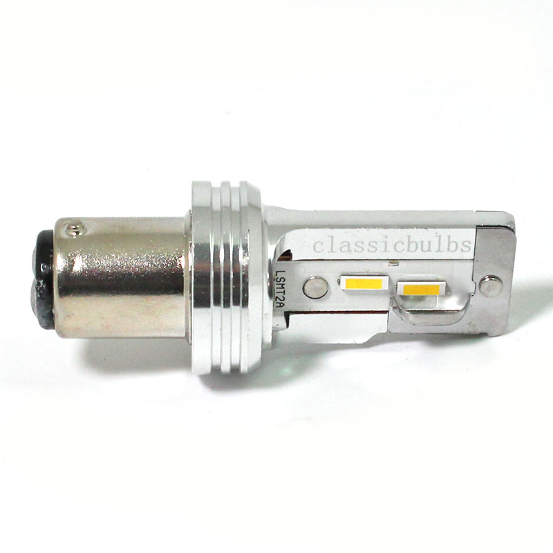 High performance CSP 1860 LED upgrade for SBC headlamp bulbs with the BA15D base. Integral aluminium heatsink. Accepts 5 to 9V input voltage - optimised for 6V, negative OR positive earth systems. High and low beam - 1600 Lumen high beam, 1600 Lumen low beam - with a soft beam pattern. In testing, much brighter (LUX measurement at fixed distance) than B170 (36/36W).
