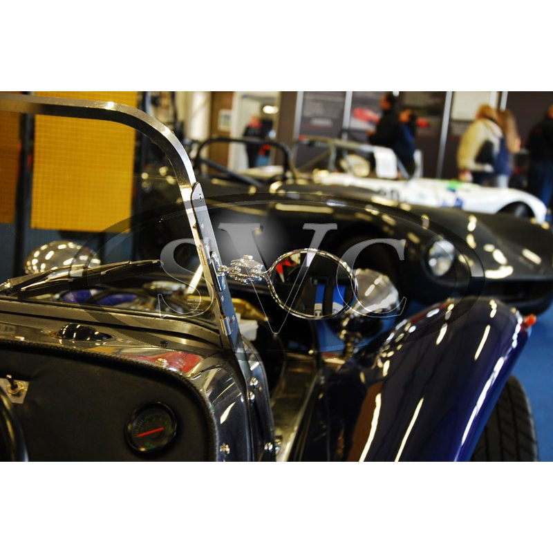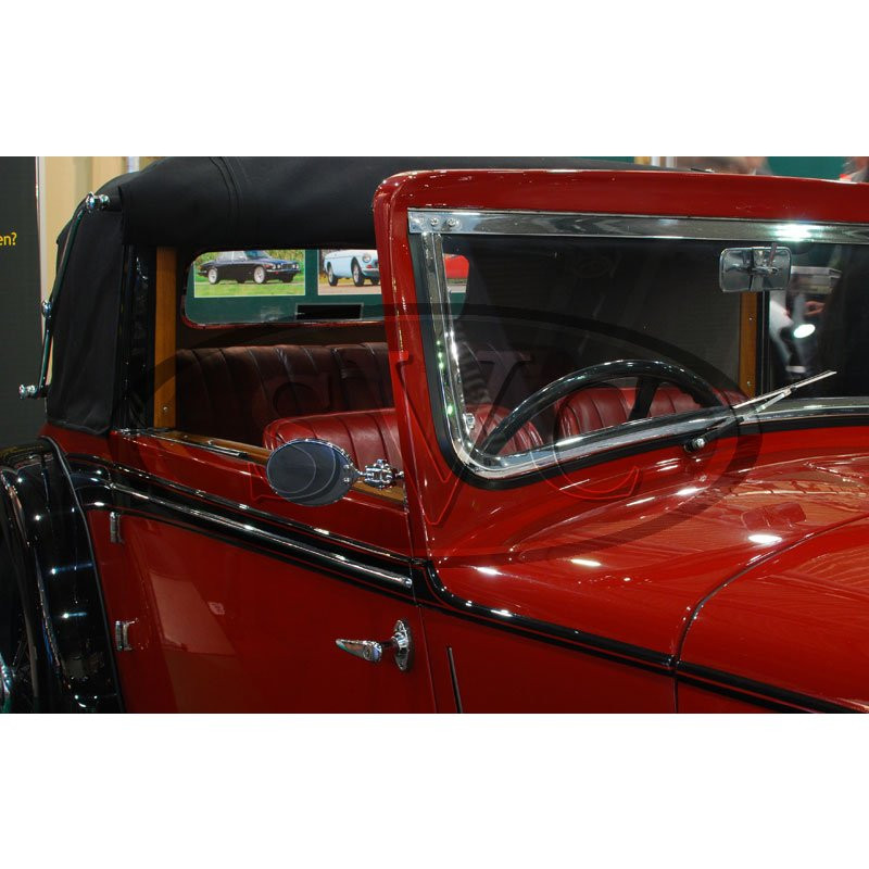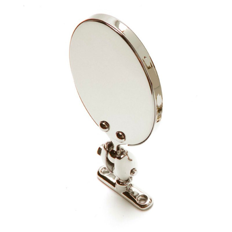 Oval mirror with jointed arm. Fine reproduction of this very popular mirror. Head size 110mm x 82mm, fitted with a CONVEX glass for ease of overtaking, concave base on two hole fixing bracket, width of hole centres 43mm. Overall width 175mm. All brass head and bracket assembly. Offered in polished brass, nickel or chrome plated finish. Very similar in style to the Raydyot M39 model. Please note, unlike our 653 mirror, this mirror is NOT embossed on the back of the mirror head.