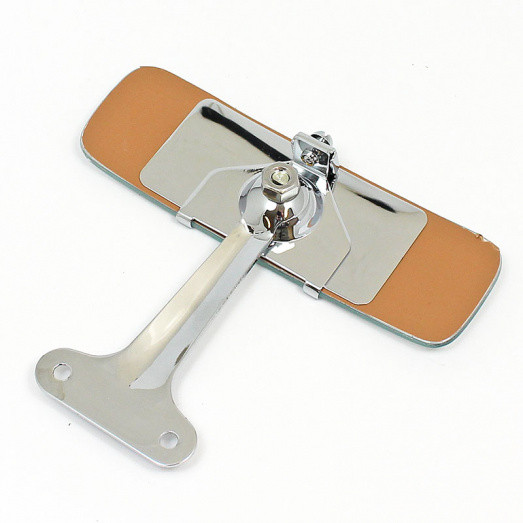 Reproduction interior rear view mirror equivalent to the Lucas 308 type. Large CONVEX mirror glass - mirror head 140mm x 43mm. Elegant two screw hole base mount as shown with 40mm hole centres. Chrome on brass finish. Overall mirror height approx 117mm
