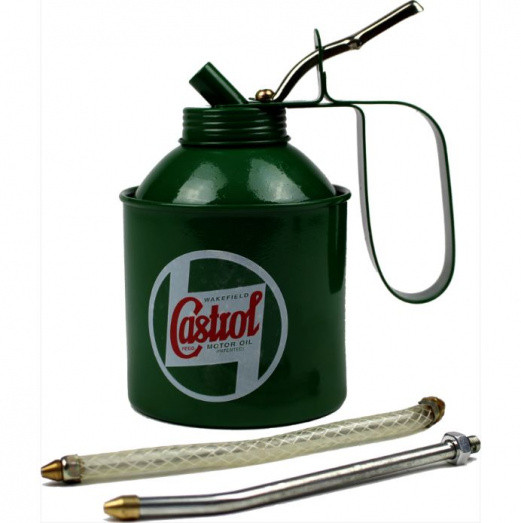 The classic Castrol oil applicator. Pump action screw top can, with interchangeable fixed and flexible applicators.