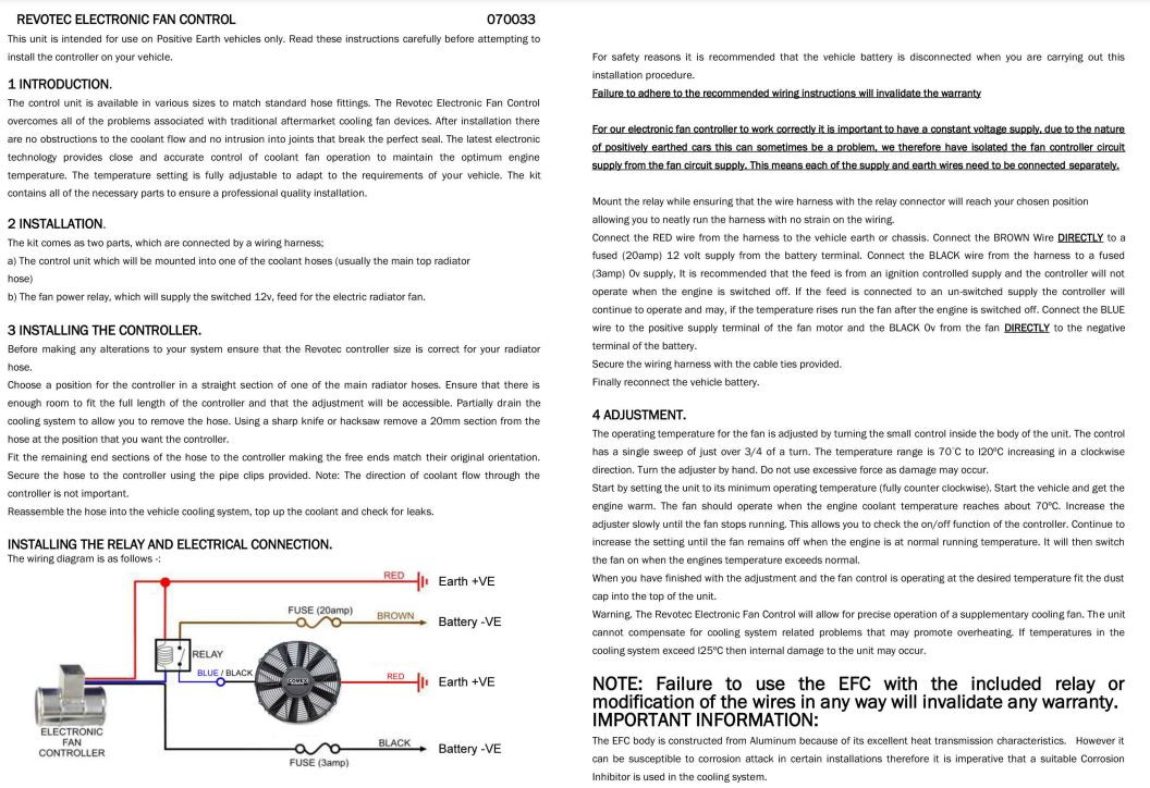 32mm hose fitting with Positive Earth Housing. Fits directly into a radiator top or bottom hose for direct water contact. Technical Information: Supply Voltage: 12v Space in hose approx: 25mm Overal length approx: 65mm Material: Aluminium Relay Rating: 30 AMPS Wire Length: 700mm Supplied With - 2 x Hose Clamps, Relay, Cap, 3 x Cable Ties, Fitting Instructions