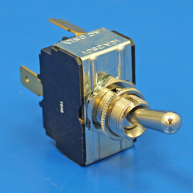 Made in England. Off/On/On heavy duty metal toggle switch rated at 10A at 12V. Approx. 12.5mm hole required.