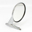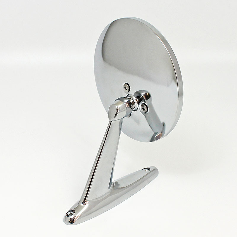 Polished stainless mirror back with chrome stem which is suitable for door or wing mounting. This elegant mirror is not handed and can be used on offside or nearside of the vehicle. 120mm diameter mirror head fitted with FLAT glass. Overall height from base to the top of the mirror head 168mm max. Mounting arm is 100mm high x 126mm long with 103mm hole centres. Supplied with a base mounting gasket.