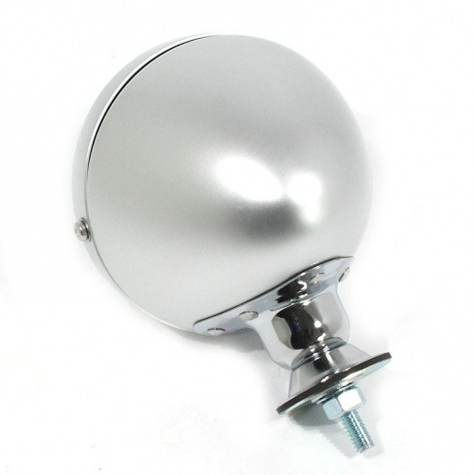 A lightweight alloy racing mirror. A reproduction of the Raydyot "Grand Prix" style model, popular on Cobras and many racing cars. The FLAT mirror glass is approx 3 1/2" (90mm) diameter. The mirror body is approximately 102mm diameter, with the shell approximately 78mm front to back. The base is 40mm diameter and fitted with an M6 stud, nut and washer. Because of its matt alloy finish, this mirror can be painted to match the body colour of the vehicle without having to use an etching primer.