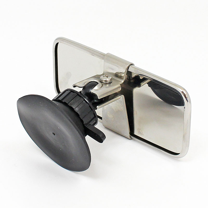 Polished stainless steel suction interior rear view mirror. Mirror head size 128mm x 56mm, with stainless steel backing and edge rim. 62mm diameter suction pad held by traditional mirror clamp bracket. Overall depth from suction pad to mirror face 70mm.