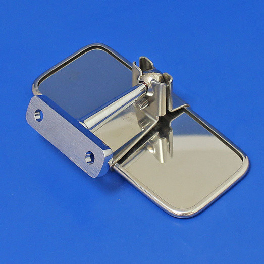 Polished stainless steel interior rear view mirror. Mirror head 128mm x 56mm with stainless steel backing and edge rim. Mounting arm 44mm long with a 58mm x 16mm mounting pad, hole centres at 40mm, ball held by traditional mirror clamp bracket, overall depth 36mm.