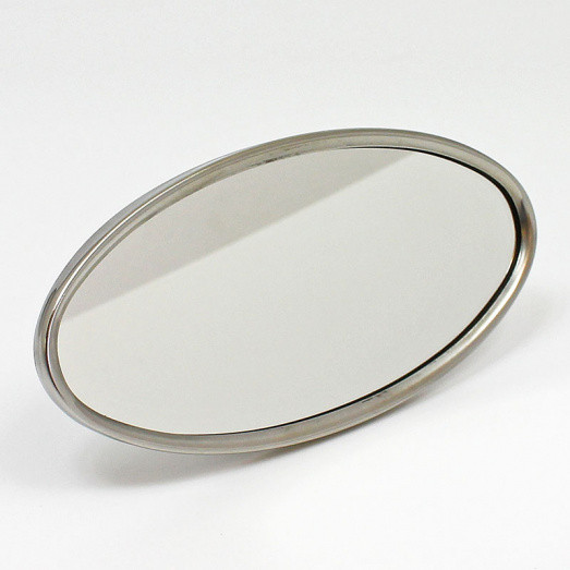 Polished stainless steel oval mirror head fitted with FLAT glass. Head size 144mm x 70mm with single stud mounting to fit directly into an arm - not supplied. Stud shaft diameter 6.3mm, with two flats at 5mm wide x 4mm long, 4.5mm thread x 6.8mm long. Supplied with chrome conical nut with two 12mm flats to tighten - nut size 3/16" No.10 UNC / 24tpi - 22mm diameter x 13mm deep.