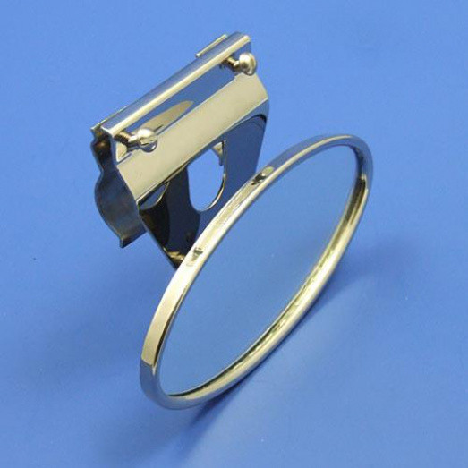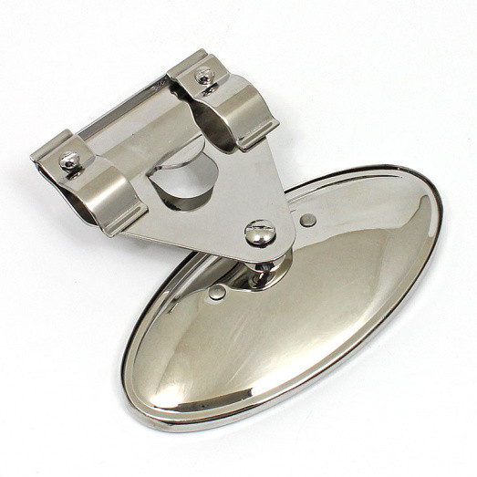Vintage interior rear view mirror with polished stainless steel bracket assembly which attaches to the top rail of open/tourer cars with a screw clamp. Flat mirror glass with oval rim and back, approx. 145mm x 73mm.