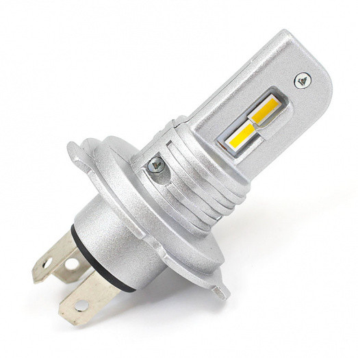 High quality LED upgrade (with heatsink) for H4 lamps with the P43T base. Set of two H4 bulbs. Flexible application - accepts 10 to 30V input voltage so suitable for 12 or 24V vehicles. Two high power LEDs on each side provide high and low beam function - specified at over 1500 Lumen high beam and 1500 Lumen low beam giving over 3000 Lumen combined. In testing, 60% brighter on low beam and 40% brighter on high beam than B472 (60/55W) but with a classic warm, white light.