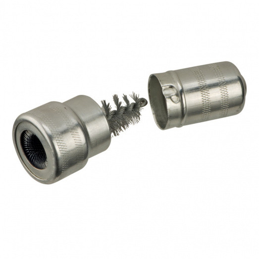Self-contained twin steel brushes. Top brush cleans battery lead terminals, bottom brush cleans battery posts.
