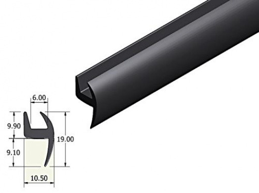 Black rubber extrusion as per illustration. Approximate overall dimensions 10.5mm x 19mm, please see the drawing for more detailed dimensions
