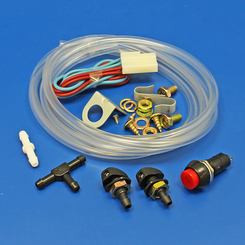 Windscreen washer accessory kit – two black double/twin washer jets, a tee piece, a straight connector, 1.8m plastic tube, a wiring loom, push switch, clips for the tube, a bracket, bolts and screws.