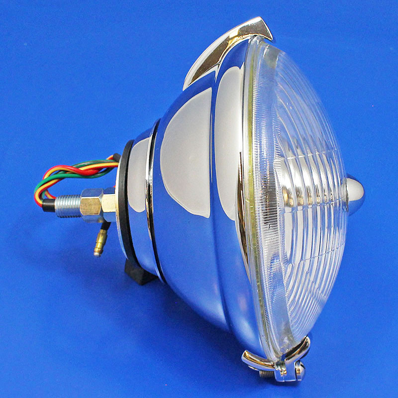 High quality reproduction fog lamp equivalent to the Lucas WFT576 type. Rear mounted. Plain, chrome plated bronze top finial. Approx 146mm diameter. Block type glass lens with chrome centre knob. All chrome body. A great recreation. Supplied with 12 volt British Pre-focus bulb. For spare/alternative bulbs, please see British Pre-focus single contact (BPF SC) P36S base bulbs. Incandescent options 6V - B172B (36W), 12V - B162 (36W), B185 or B323B (48W), 24V - B606 (44W). For halogen upgrade 12V - B185BH (48W). For LED options - for transverse filament (better for fog lamps) please see part numbers P36SLED-S43AX and P36SLED-S43TR.