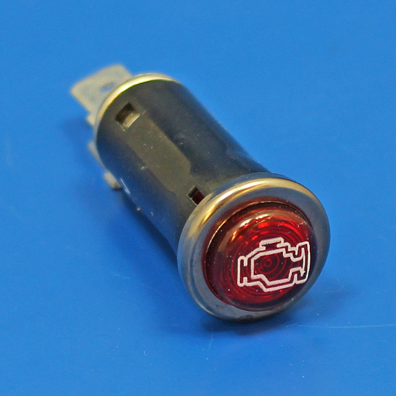 Chrome rimmed panel warning light, red engine warning. Rim diameter 16mm approx, Hole required 12.5mm approx. Fitted with BA7S bulb holder and 12V 2W bulb as standard. 6.3mm push on spade/Lucar rear terminal connections. For replacement/alternative bulbs, please order B282B (6V), B281B (12V) or B283B (24V)